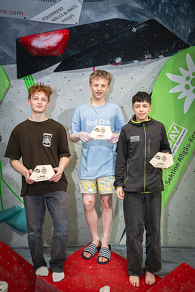 Und auch bei den Herren ging der Sieg dieses Mal nicht an den Favoriten: Thomas Knab (Team Kraftwerk Biessenhofen), der sowohl die Qualifikation als auch das Halbfinale als Führender abschließen konnte, zeigte im Finale Nerven und wurde am Ende mit nur einem gekletterten Finalboulder und zwei weiteren Zonenwertungen Sechster. Dafür legte aber sein Teamkollege Josef Eberle einen beeindruckenden Auftritt hin und sicherte sich mit drei Tops und einer Zone nicht nur sein erstes Allgäu-Moves-Podium, sondern gleich seinen ersten Sieg. Diesen hatte er sich vor allem mit einem hart erkämpften Top am spektakulären letzten Boulder verdient. Ein weiteres Top gelang hier nur noch dem ehemaligen Nationalkaderathleten Moritz Winkler (DAV Stuttgart), der sich mit insgesamt drei Tops hinter Eberle Platz zwei sichern konnte. Auf Platz drei folgte mit zwei gekletterten Bouldern und zwei weiteren Zonenwertungen Lokalmatador Lorenz Naumann (DAV Allgäu-Kempten). Als eine besonders harte Nuss erwies sich Boulder Nummer drei: Keinem der Finalisten gelang es, den athletischen und pressigen Boulder weiter als zur Zone zu klettern.