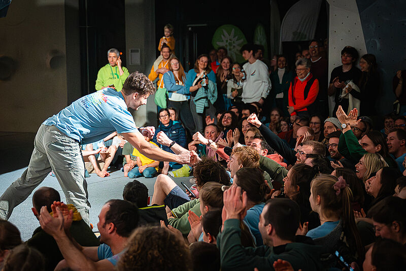 Und hier hieß es dann wieder bis zur letzten Minute der sechs Stunden Kletterzeit: Alles geben und die letzten Hautreserven opfern! Für die besten sechs Damen und sechs Herren des Rankings war der Klettertag mit dem Ende der Halbfinalzeit um 16 Uhr allerdings noch nicht zu Ende, denn es wartete ja noch das große Finale am Abend. Vor vollem Haus und bei großartiger Stimmung lieferten die Finalistinnen und Finalisten hier dann eine große Show – und das, obwohl allen bereits ein langer Bouldertag in den Knochen steckte und alle bereits durchgekletterte Finger hatten. Das begeisterte Publikum sah viele spektakuläre Begehungen der Finalboulder – die Routenbaucrew hatten hier wieder tief in die Trickkiste gegriffen und das komplette Anforderungsprofil von athletisch bis technisch abgefragt.