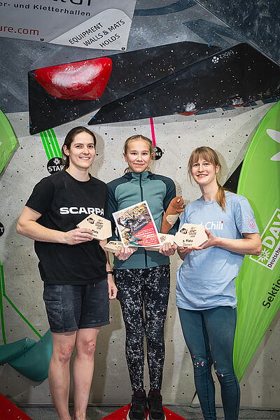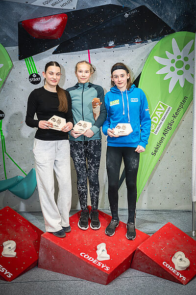 Bei den Damen sah es vor dem Halbfinale nach einer klaren Sache für die die zweimalige Allgäu-Moves-Siegerin Catrin Gorzellik (DAV Reutlingen) aus, die die Qualifikation mit deutlichem Vorsprung als Erste abgeschlossen hatte. Und so war es eine echte Überraschung, als nach dem Halbfinale die junge Münchnerin Aleksandra Mishan (USC München) die Wertung anführte. Die frischgebackene bayerische U15-Jugendmeisterin im Bouldern zeigte dann auch im Finale, dass sie zurzeit in einer bestechenden Form ist: Mishan machte sich einen kleinen Patzer von Catrin Gorzellik an Boulder Nummer zwei zu Nutze und sicherte sich mit vier Top-Begehungen knapp, aber verdient den Sieg. Gorzellik konnte ebenfalls alle vier Finalboulder klettern, benötigte dafür aber einen Versuch mehr. Mit drei Tops und einer weiteren Zonenwertung boulderte Clara Notholt (Isny) auf Platz drei.