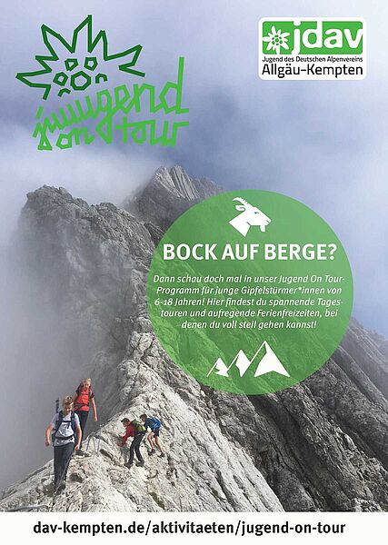 Nach einigen Jahren im Dornröschenschlaf haben wir unser Jugend On Tour-Programm reaktiviert und werden ab sofort wieder mit Ferienfreizeiten und Tagesaktivitäten in allen möglichen Bergsportdisziplinen loslegen. Die Angebote richten sich an alle jungen Sektionsmitglieder von 6 bis 18 Jahren, die gerne draußen in den Bergen unterwegs sind. Schaut doch immer wieder mal auf unsere Unterseite: https://www.dav-kempten.de/aktivitaeten/jugend-on-tour Dort können wir euch hoffentlich in den nächsten Wochen weitere Aktivitäten präsentieren. Nachdem sich nun auch die Corona-Regeln deutlich gelockert haben, sind wir optimistisch, dass wir allen Nachwuchsbergsteigern einen spannenden Bergsommer bieten können.