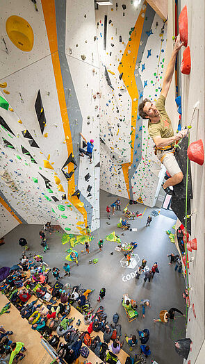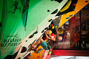 Bei den Herren sicherte sich der schon im Vorfeld als Favorit gehandelte Münchner Steffen Hilger (26) den Sieg vor Stefan Heubusch (31) aus Illertissen sowie Jonas Atz (33) aus Weingarten. das Herrenfinale war äußerst spannend - sowohl Heubusch als auch Hilger toppten beide die Finalroute, Hilger holte sich jedoch aufgrund des besseren Qualifikationsergebnisses den Tagessieg. Die Ü40-Wertungen gingen an Lokalmatadorin Birgit Schmidkonz (52) - die sich als einzige weibliche Ü40-Starterin mutig den "jungen" Damen im Finale stellte. Bei den Herren waren dann aber gleich eine ganze Reihe "alter Recken" angetreten, die aber immer noch ordentlich Dampf in den Armen hatten und auch in Sachen "Retro-Outfit" die originalgetreusten Styles zu bieten hatten. Am Ende hatte der "Ü40-Youngster" Thomas Müller (40) aus Friedrichshafen die meisten reserven und sicherte sich die Allgäuer Kässpatzenschüssel-Trophäe des Partners CODESYS sowie das Seil von Hauptsponsor Edelrid. Auf Platz zwei kletterte Hansi Kassner aus Illertissen vor dem langjährigen Ü40-Matador des Allgäu Cups, Klaus Zugmaier aus Leutkirch. Klaus überzeugte aber nicht nur mit seinem Kletterkönnen: Seine beeindruckende "Raubtier"-Leggins sorgte für eine Nominierung in der Retro-Outfit-Wertung. Beim Finale der U15-Klasse der Mädchen hatten sich die Routenbauer etwas verschätzt – so konnten gleich sieben der acht Finalistinnen die Route top klettern und es musste das Ranking aus der Qualifikation herangezogen werden. Der Sieg ging dann an die Favoritin aus unserer Sektion: Carla Schirutschke hatte in der Qualifikation am meisten Punkte gesammelt und gewann damit auch im Finale vor Alea Herpich (Allgäu-Immenstadt) und Jasmyn Glover (München-Oberland). Bei den U15-Jungs war das Finale eine rein Kemptner Angelegenheit: Alle sechs Finalisten kamen aus dem Climbing Team der Sektion! Und dann hatte einer der Kleinsten auch noch am meisten Dampf: Lukas Götzl holte sich in beeindruckender Manier den Tagessieg vor Jonas Wagner und Fabian Götzl und durfte damit auch eine der handgefertigten Kässpatzenschüsseln mit nach Hause nehmen.