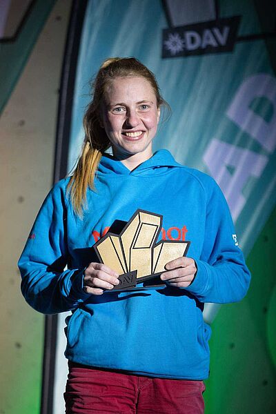 Bei den Damen gehörte Martina Demmel nach dem Vizemeistertitel im Vorjahr und drei Weltcup-Halbfinaleinzügen in diesem Jahr ebenfalls zu den Topfavoritinnen. Die 19-jährige aus Bobingen, die erst seit vier Jahren klettert, hatte zudem im Frühjahr mit schwersten Felsbegehungen international auf sich aufmerksam gemacht. Martina gehörte sowohl in der Qualifikation als auch im Halbfinale immer zu den drei stärksten Damen und ließ auch im Finale nichts anbrennen: In der extrem schwierigen und athletischen Route kam sie am besten zurecht und sicherte sich den Titel knapp vor Lokalmatadorin Sandra Hopfensitz (DAV Augsburg) und Lucie Molitor (Zweibrücken). Sowohl Hopfensitz als auch Molitor hatte man für das Podium eigentlich vorher nicht wirklich auf der Rechnung gehabt - die weiteren Favoritinnen Hannah Meul (DAV Rheinland-Köln), Lucia Dörffel (Chemnitz) und Roxana Wienand (Aschaffenburg) hatten aber unerwartet Schwierigkeiten mit der Finalroute. Martina Demmel belohnte sich mit ihrem ersten Meistertitel für eine sehr erfolgreiche Saison, die ihr aufgezeigt haben dürfte, wo die sportliche Reise bei ihr noch hingehen kann. In ihrer ersten vollen Weltcupsaison kletterte sie international auf Anhieb auf Platz 15 – und das trotz ihrer im Vergleich zu den Mitkonkurrentinnen fehlenden Wettkampferfahrung. Für Martina wird im kommenden Jahr die entscheidende Frage sein, ob sie sich noch stärker auf das Wettkampfklettern fokussieren und dafür ihre ausgewiesene Leidenschaft Felsklettern etwas hintenanstellen will. Die bevorstehende Winterpause der Wettkampfkletterer sollte ihr nun aber genug Zeit geben, um sich über die Ziele der kommenden Saison Gedanken zu machen.