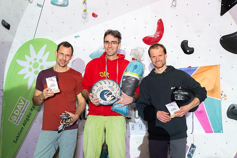 Großer Sport wurde auch wieder bei den Ü40-Herren geboten, die die Podiumsplätze in einem Kopf-an-Kopf-Rennen ausmachten: Knapp die Nase vorn hatte am Ende der Vorjahreszweite Thomas Müller (DAV Friedrichshafen), der zwar im Finale die gleiche Höhe wie Markus Musil (DAV Allgäu-Kempten) erreichte, in der Qualifikation aber etwas mehr Punkte gesammelt hatte. Und auch Platz drei wurde über die Vorrundenergebnisse vergeben: Erdmann Käppeler (DAV Allgäu-Kempten) sicherte sich aufgrund des besseren Qualifikationsergebnisses den letzten Stockerlplatz, nachdem er im Finale die gleiche Höhe wie Hansi Kassner (Illertissen) erklettert hatte.