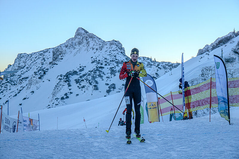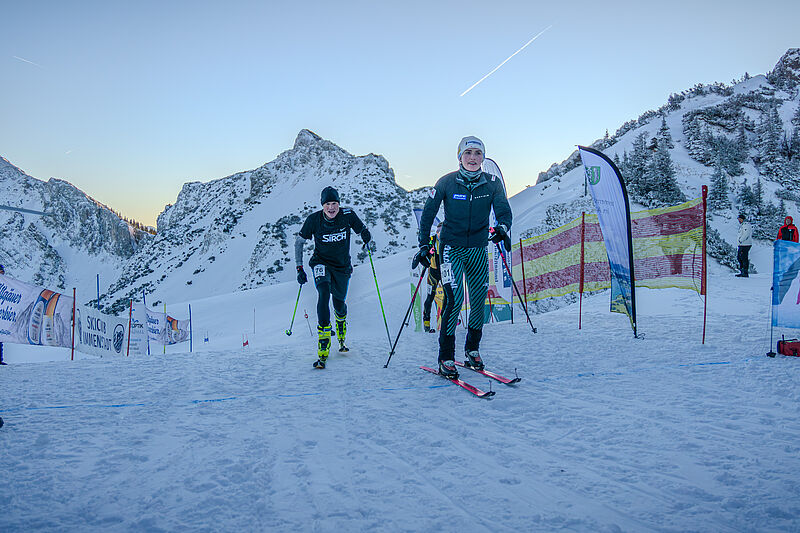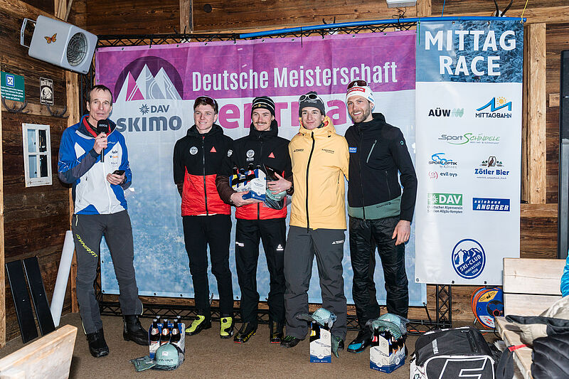 Tags darauf wartete dann das traditionelle Vertical über knapp 600 hm auf die 80 Teilnehmer*innen, die bei eisigen Temperaturen von -19 Grad auf die Strecke gehen mussten. Hier teilte sich dann unser Sektionsmitglied Marc Dürr das Rennen am besten ein: Lange Zeit lief er in der Spitzengruppe mit und sorgte dann kurz vor der Bergstation mit einer Tempoverschärfung, der keiner der Konkurrenten folgen konnte, für einen kleinen Vorsprung bis ins Ziel, das Dürr nach 25:39 min erreichte. Damit sicherte er sich nach vier Deutschen Meistertiteln im Individual nun erstmals auch den Titel im Vertical. Hinter Dürr folgten gute fünf Sekunden später Moritz Bauregger (DAV Berchtesgaden) auf Platz zwei und Sektionsmitglied David Sambale zeitglich mit dem österreichischen Vorjahressieger Daniel Zugg (SC Montafon) auf Platz drei. So standen mit Marc Dürr und David Sambale gleich zwei Sektionsvertreter auf dem DM-Podium.