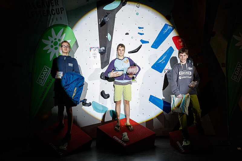Bei den männlichen U15-Jugendlichen sorgte dann der Neu-Ulmer Jakob Probst für eine beeindruckende Show: Jakob hatte bereits in der Qualifikation als einziger Jugendstarter die vier schwersten Routen problemlos gemeistert und wäre mit dieser Leistung auch bei den Herren ins Finale gekommen. Im Jugendfinale setzte er dann noch einen drauf und kletterte auch dieses Mal mühelos bis zum Top. Damit holte er sich verdient den Tagessieg vor den beiden Kemptnern Christian Kupfahl und Lukas Götzl.