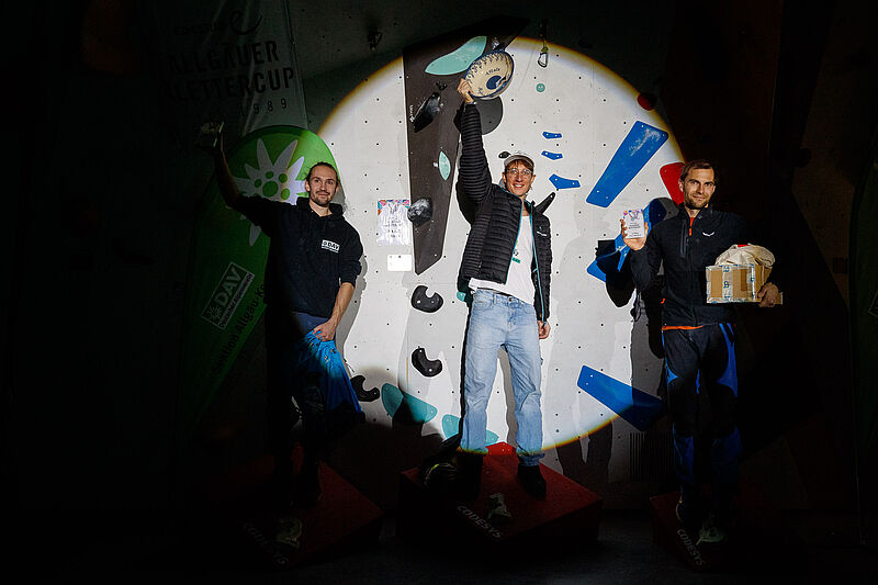 Besonders spannend war es dann bei den Herren, denn hier hatten gleich drei Starter in der Qualifikation die vier schwersten Routen top geklettert. Am Ende hatten zwei Kletterer vom DAV Schwäbisch-Gmünd die Nase vorn: Alexander Hille, ehemaliges Nationalkader-Mitglied und TV-bekannter Ninja Warrior, kam in der schwierigen Finalroute am weitesten und sicherte sich mit zwei Zügen Vorsprung den Tagessieg und die Kässpatzenschüssel vor Teamkollege Jörg Müller. Mit einer starken Vorstellung kletterte der Kemptner Peter Staudigel auf Platz drei. Die ebenfalls in der Herrenfinalroute ausgetragene Ü40-Wertung sicherte sich der Merklinger Rainer Fuchs vor Thomas Müller (Friedrichshafen) und Marc Autor (Allgäu-Kempten).