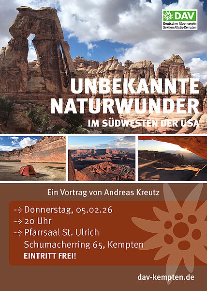 Keine andere Region Amerikas präsentiert ihre Naturwunder auf so bizarre, ungezähmte und fantastische Weise wie das riesige, von Flüssen und Canyons zerfurchte Colorado-Plateau von Utah, New Mexico und Arizona. Dabei sind nicht immer die berühmtesten Nationalparks auch die Schönsten, sondern oftmals auch die kleineren und weniger bekannten Parks mit ihren landschaftlichen Kostbarkeiten und Outdoor-Möglichkeiten. Andreas Kreutz hat nicht nur jahrelang in den USA gelebt, sondern auch insbesondere den Südwesten immer wieder intensiv bereist. Auf seine Zuschauer wartet ein spannender Vortrag mit eindrucksvollen Bildern und Geschichten aus diesem Teil der USA.
