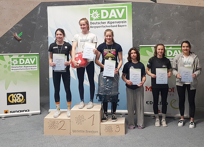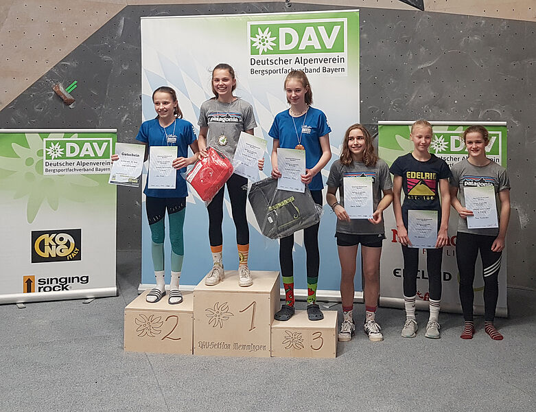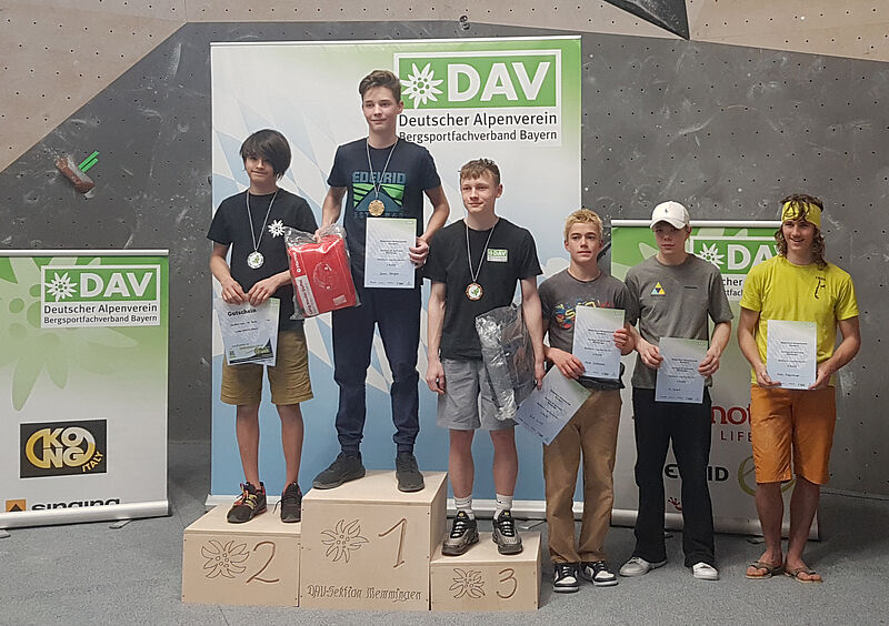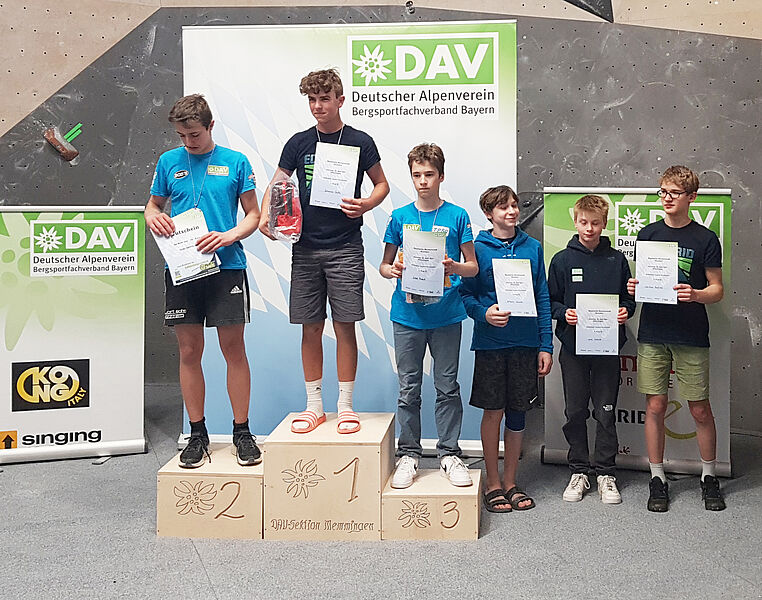 Mit einem großen Team waren die Nachwuchskletterer unserer Sektion am vergangenen Samstag zur bayerischen Jugendmeisterschaft im Boulder nach Memmingen gereist: Insgesamt 13 Teilnehmerinnen und Teilnehmer stellte die Sektion, die damit hinter München-Oberland das zweitstärkste Team beim Wettkampf aufbot. Und diese zahlenmäßige Stärke zeigte sich am Ende auch bei der Erfolgsbilanz: Nach einer anspruchsvollen Qualifikationsrunde mit perfektem Routenbau hatten es insgesamt neun Kemptner in die Finals geschafft. Dort sorgte bei der Jugend B ein vermeintlicher Außenseiter für einen Paukenschlag: Johannes Grotz erreichte als einziger der Starter die Zonenwertung im schweren Plattenboulder Nummer eins und kletterte danach alle drei weiteren Finalboulder. Damit holte er sich verdient den Meistertitel in der Jugend B – und damit auch den größten Erfolg seiner bisherigen Wettkampfkarriere. Mit Christian Kupfahl (6.), Lukas Götzl (9.) und Fabian Götzl (10.) waren die Kemptner außerdem mit drei weiteren Startern stark im Finale vertreten. Auch bei der weiblichen Jugend B schafften es mit Pia Neumeier und Lena Wagner zwei Kemptnerinnen ins Finale. Dort holte Pia Neumeier mit einem starken fünften Rang ebenfalls ihr bisher bestes Wettkampfergebnis, Lena Wagner wurde Neunte. Zwei weitere Kemptnerinnen verpassten dieses Mal leider den Einzug ins Finale der B-Jugend: Lisa Keller wurde 13., Johanna Diepolder 20.