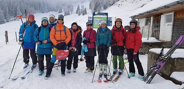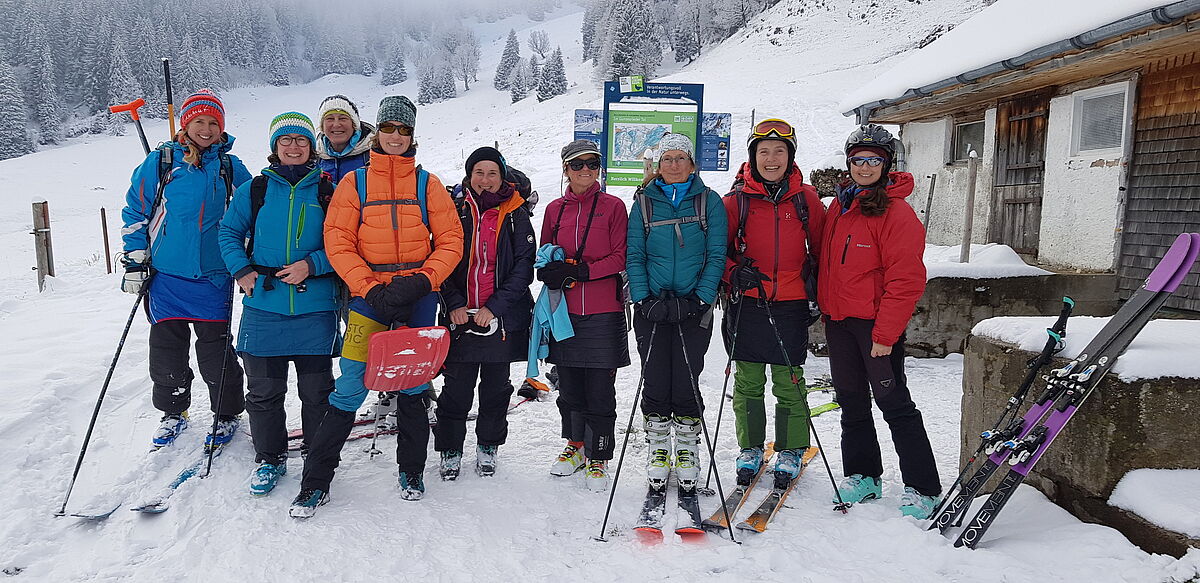Viele Frauen sind gerne mit den Tourenski unterwegs - so auch wir in unserer Gruppe. Uns findet man vor allem auf Tagestouren im Allgäu, ein bis zwei Mal pro Saison gönnen wir uns aber auch verlängerte Wochenenden, bei denen wir viel Spaß haben und die uns einen Einblick in andere Gebiete geben. Zusätzlich zu den Touren treffen wir uns, um unser persönliches Können zu verbessern, z.B. bei der LVS Suche oder beim Tiefschneefahren. Unterwegs freuen wir uns auf schöne, auch anspruchsvolle Gipfel und Abfahrten, lassen uns aber auch Zeit zum Staunen und Genießen von kleinen Dingen und besonderen Augenblicken.