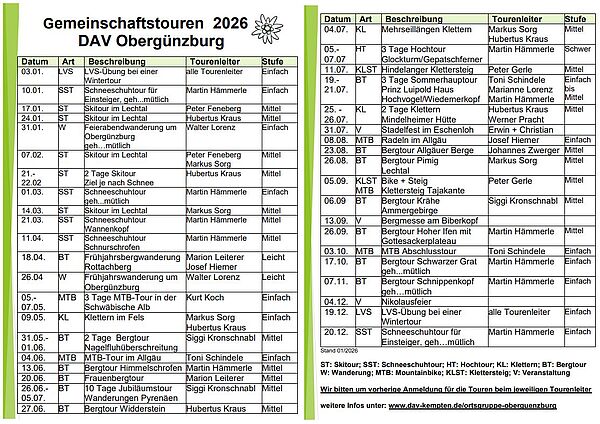 Jeden 1. Mittwoch des Monats mit Touren- und Gruppenbesprechung. Treffpunkt für Jung und Junggebliebene. Zu allen Touren kann man sich hier informieren und anmelden. Der Beginn im Sommer von April bis September ist um 20.00Uhr, im Winter von Oktober bis März um 19.00Uhr im AV-Heim in Obergünzburg. Die jeweiligen Termine werden zusätzlich in der Tageszeitung veröffentlicht.