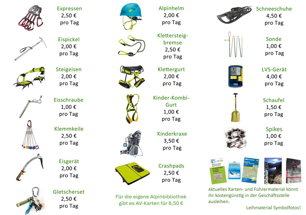 Eine Grundvoraussetzung für sichere Bergsportaktivitäten ist eine gute Ausrüstung. Als Sektionsmitglied hast du die Möglichkeit, in unserer Geschäftsstelle aktuelle Bergsportausrüstung kostengünstig zu leihen (Liste unten Symbolfotos).