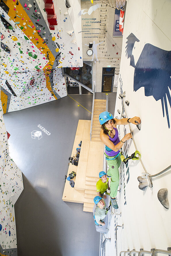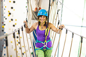 An unserem indoor-Klettersteig "Adlersteig" können Klettersteigfreund*innen das ganze Jahr über wetterunabhängig Höhenluft schnuppern. Als besonderes Highlight wartet am Ende die Seilbrücke auf die Aspirant*innen. Zuvor sorgen senkrechte Leitern, Plattformen und schließlich die luftige Querung direkt unter dem Hallendach schon für ordentlich Adrenalin. Egal ob zur Vorbereitung auf die outdoor-Klettersteigsaison oder einfach nur, um einmal das swoboda alpin aus einer anderen Perspektive zu erleben: Auf dem Adlersteig hat man in jedem Fall den besten Blick über die gesamte Halle!