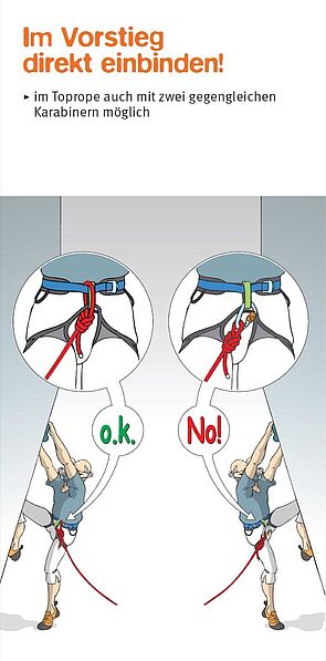 Binde dich im Vorstieg immer direkt in den Anseilpunkt des Gurtes ein. Im Toprope kannst du dich alternativ auch mit Safebiner (Karabiner mit doppelter Verschlusssicherung) oder zwei gegengleich eingehängten Karabinern einbinden. Die verwendeten Seile müssen mindestens 40 Meter lang sein!