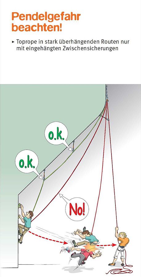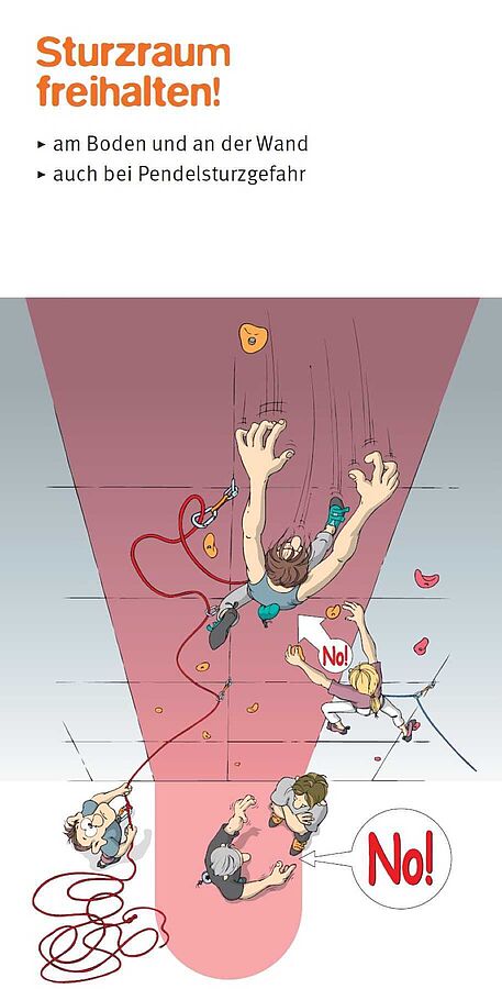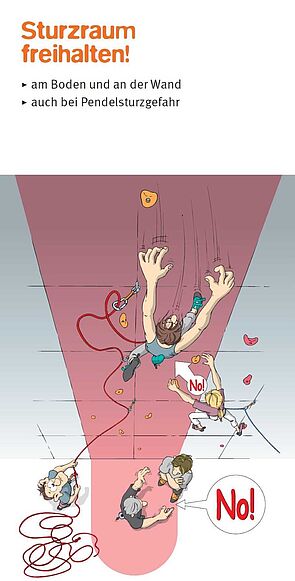 Achte auf einen freien Sturzraum an der Wand und am Boden. Klettere nicht im Sturzraum anderer. Überhole nur in Absprache mit dem Vorauskletternden – er hat grundsätzlich »Vorfahrt«. Vermeide Pendelstürze!