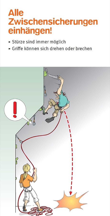 Griffe können sich drehen oder brechen, deshalb musst Du alle Zwischensicherungen einhängen. Spontane Stürze sind immer möglich. Informiere möglichst deinen Partner bevor du dich ins Seil setzt oder stürzt.