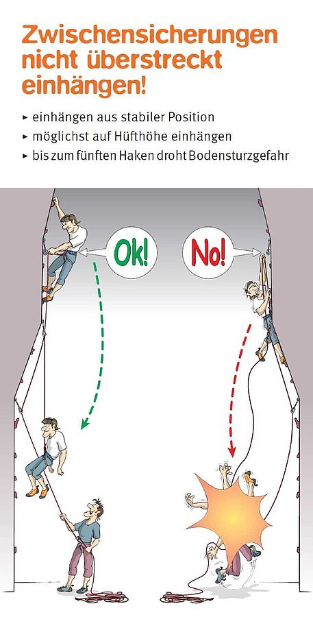 Hänge alle Zwischensicherungen aus stabiler Position, nicht überstreckt und möglichst auf Hüfthöhe ein. Bis zum 5. Haken droht Bodensturzgefahr!