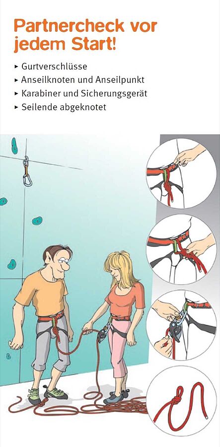 Benutze nur geeignete (zertifizierte) und zeitgemäße Ausrüstung. Vor jedem Kletterstart erfolgt der Partnercheck: