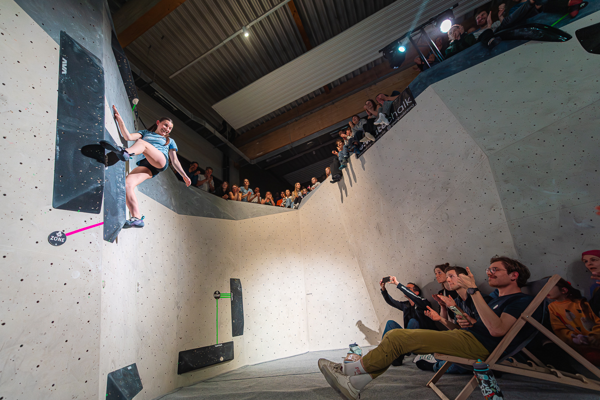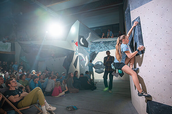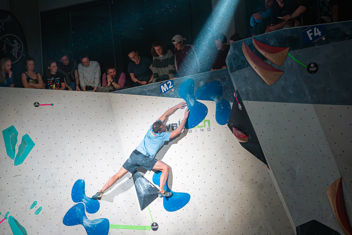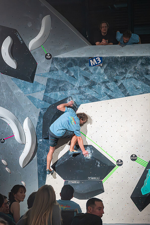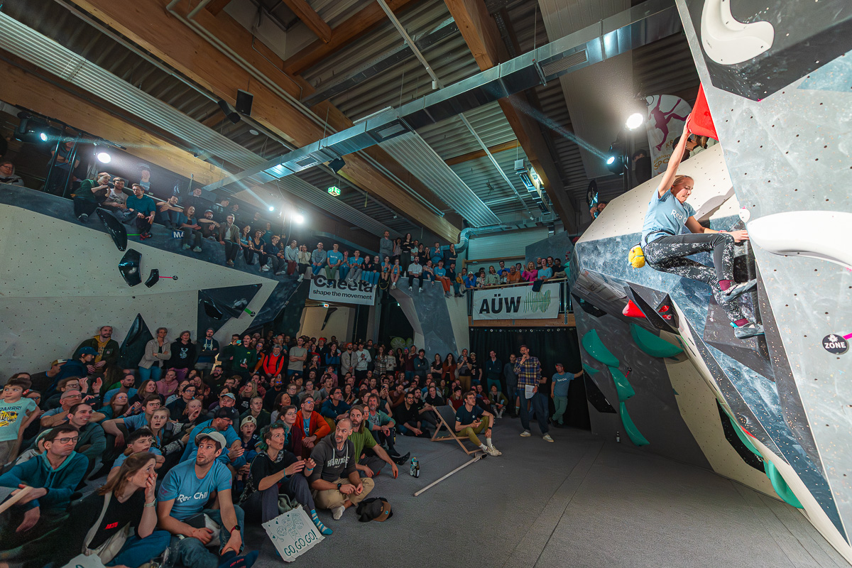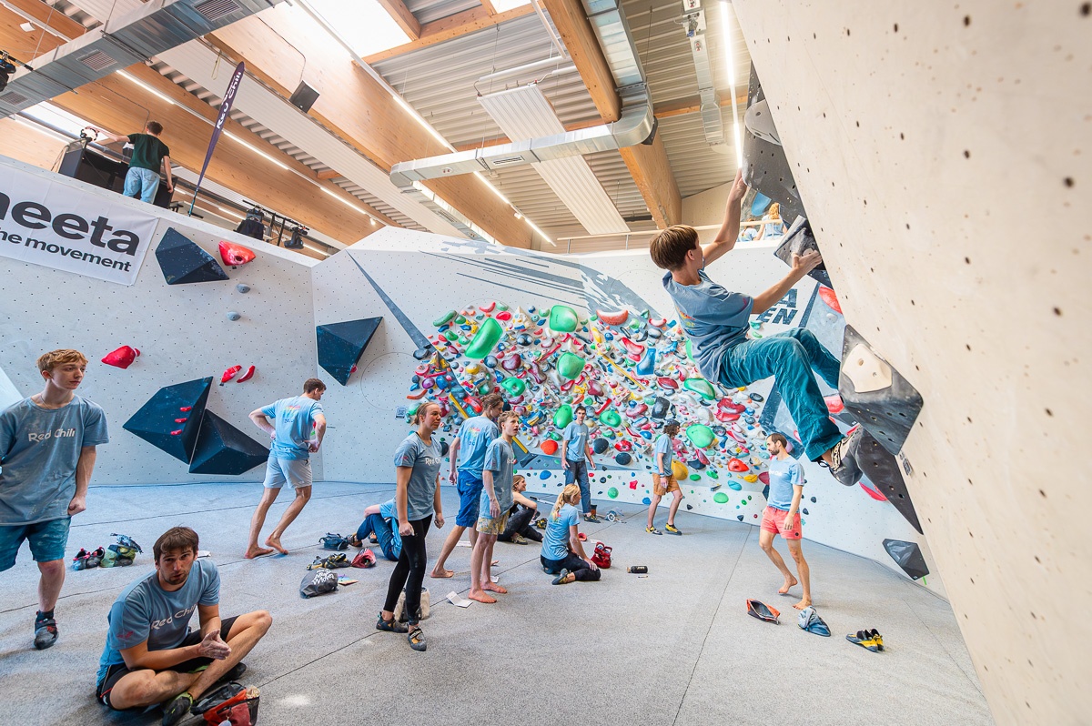 Beim Finalevent müssen die Teilnehmer*innen wieder möglichst viele der 35 neuen Boulder knacken – diesmal haben alle Boulder auch eine zusätzliche "Zonen"-Wertung und markierte Startpositionen für alle 4 Extremitäten. Nach Ende der Kletterzeit für das Halbfinale tragen alle Teilnehmer*innen ihre Boulder bis zum Ende des Scoringzeitraums ein. Danach stehen die besten 6 Damen und 6 Herren der offenen Klasse für das große Finale am Abend fest. Wenn es hier Jugendliche oder Ü40/Ü50-Starter unter die besten 6 schaffen, starten sie natürlich auch im Finale. Ansonsten werden die Ergebnisse der Altersklassen aus der Gesamtliste herausgerechnet.