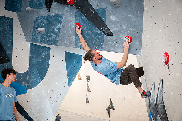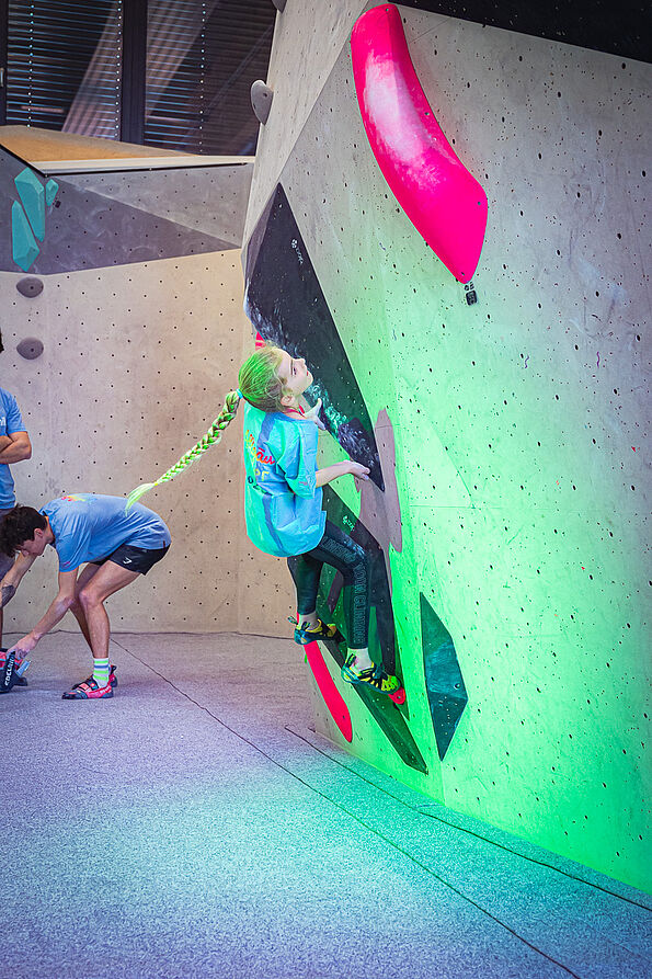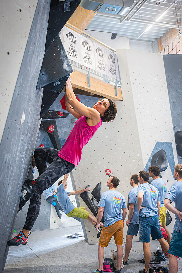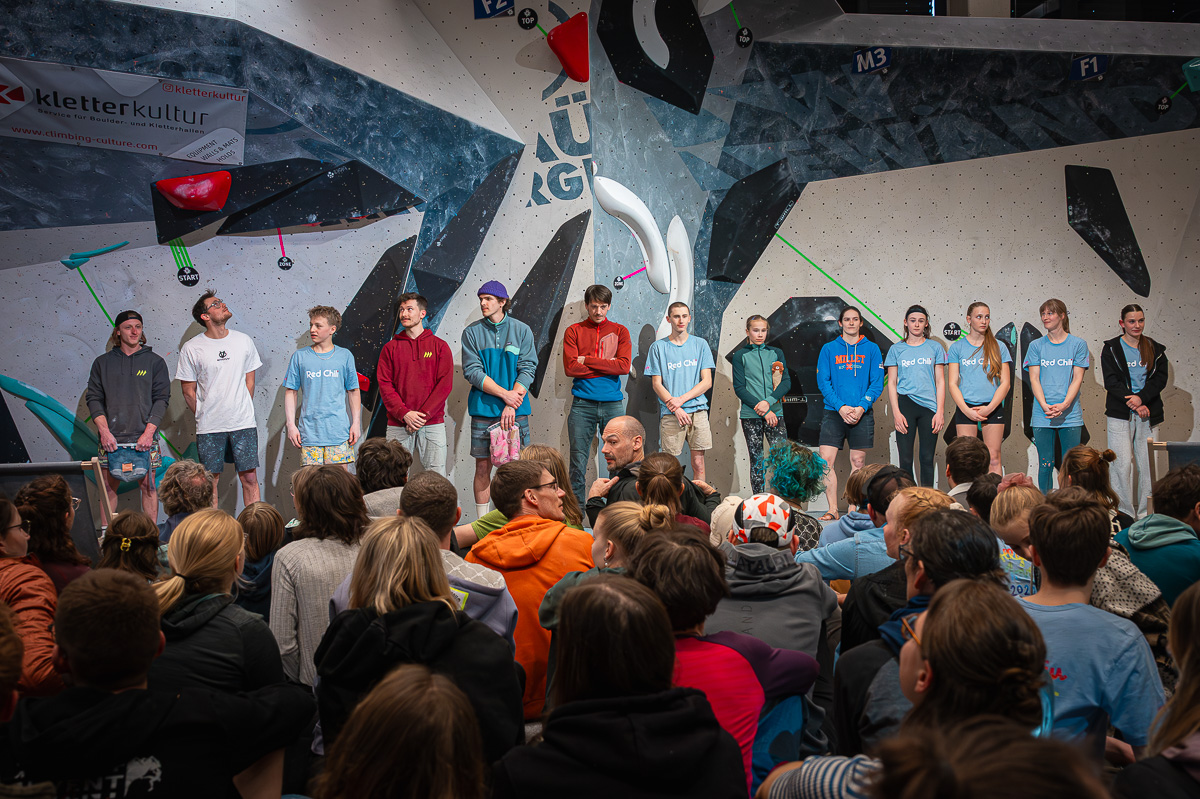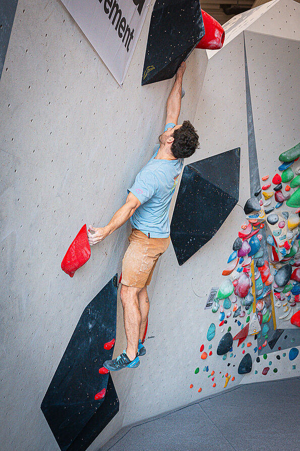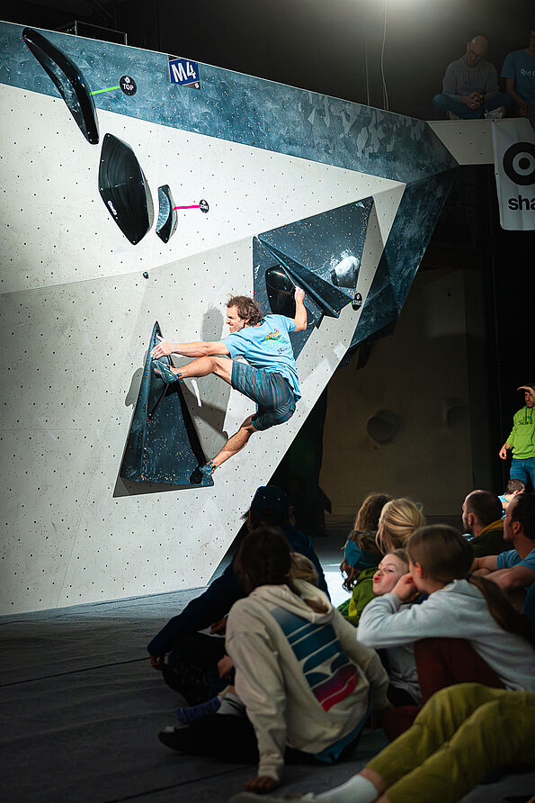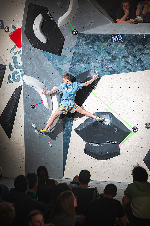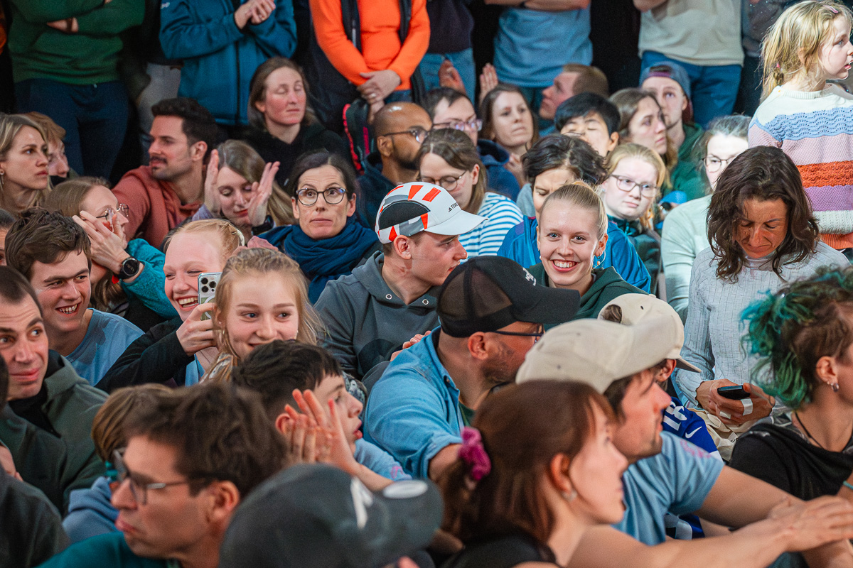 Beim Finalevent müssen die Teilnehmer*innen wieder möglichst viele der 35 neuen Boulder knacken – diesmal haben alle Boulder auch eine zusätzliche "Zonen"-Wertung und markierte Startpositionen für alle 4 Extremitäten. Nach Ende der Kletterzeit für das Halbfinale tragen alle Teilnehmer*innen ihre Boulder bis zum Ende des Scoringzeitraums ein. Danach stehen die besten 6 Damen und 6 Herren der offenen Klasse für das große Finale am Abend fest. Wenn es hier Jugendliche oder Ü40/Ü50-Starter unter die besten 6 schaffen, starten sie natürlich auch im Finale. Ansonsten werden die Ergebnisse der Altersklassen aus der Gesamtliste herausgerechnet.